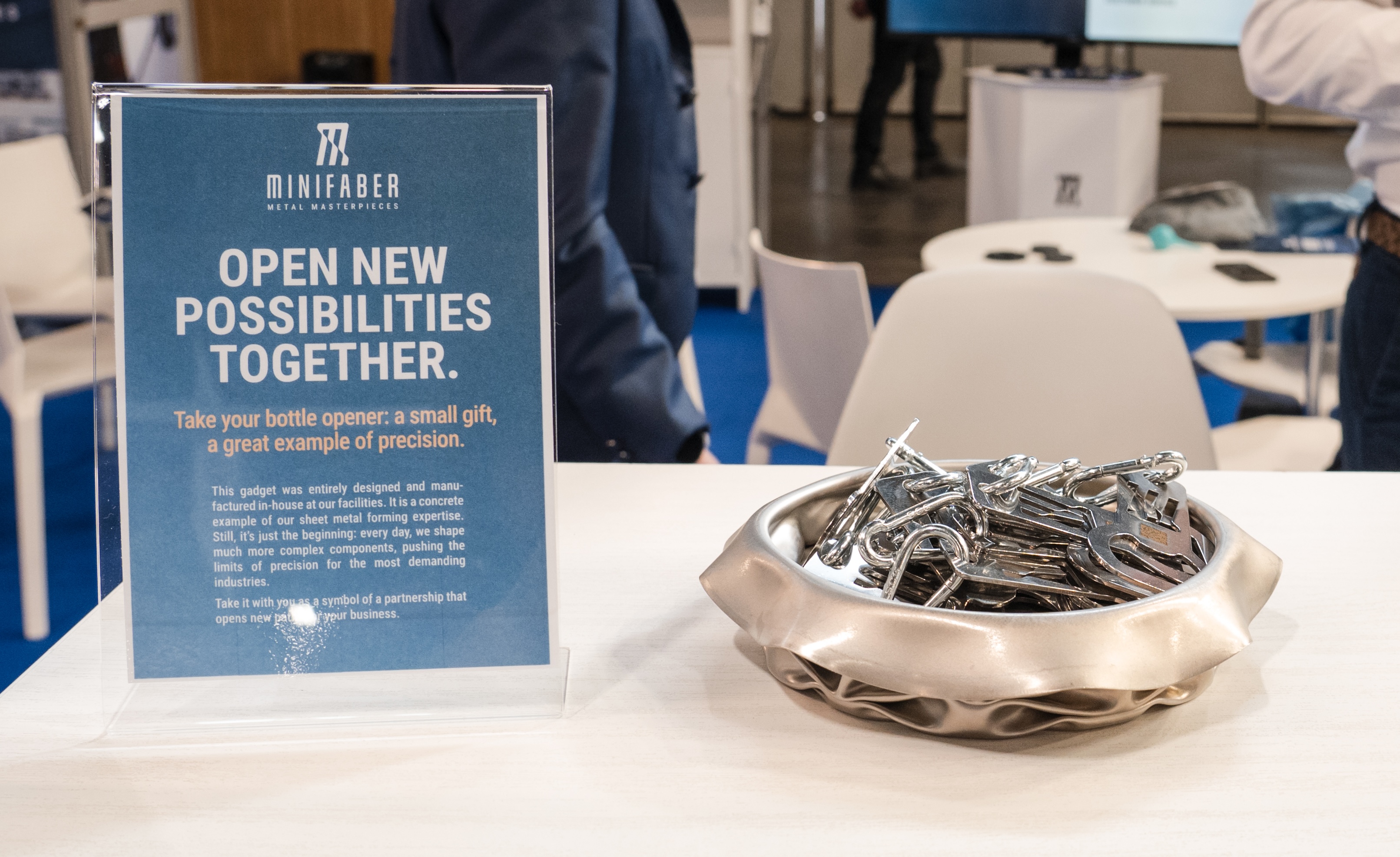 Gli apribottiglie in metallo realizzati interamente da Minifaber hanno riscosso grande interesse: un oggetto semplice, funzionale, che descrive in modo concreto la nostra capacità di lavorare il metallo con precisione. Molti visitatori hanno apprezzato il fatto che fosse prodotto internamente, un dettaglio che ha permesso di aprire conversazioni sulla nostra filiera completa.